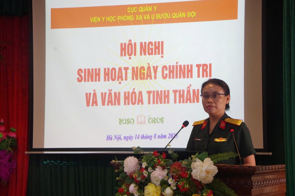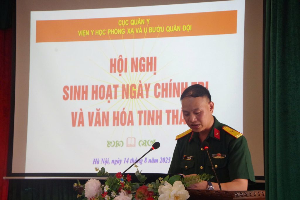 Ngày 14/8/2025, Viện Y học phóng xạ và U bướu Quân đội đã tổ chức Hội nghị sinh hoạt ngày chính trị và văn hóa tinh thần với sự tham gia đầy đủ của cán bộ, nhân viên, chiến sĩ trong toàn Viện. Hoạt động nhằm nâng cao nhận thức chính trị, bồi dưỡng bản lĩnh, tinh thần đoàn kết, trách nhiệm cho đội ngũ cán bộ, nhân viên; đồng thời thúc đẩy phong trào thi đua quyết thắng, xây dựng đơn vị vững mạnh toàn diện.